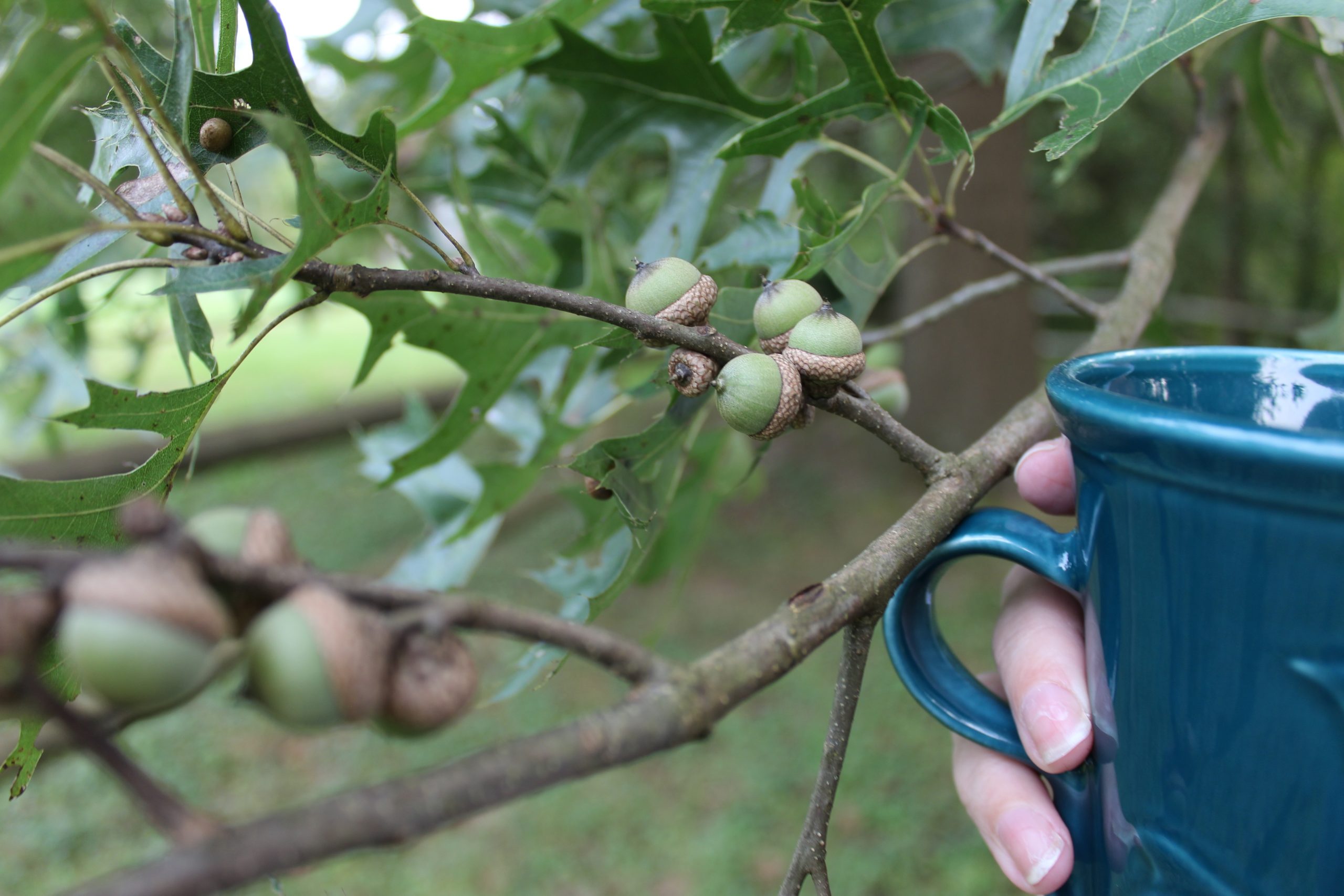The view from my cup… imminent sign of fall, or precursor of horrific winter? Acorns, part of nature’s granola for squirrels. I watch with amusement and fascination as a squirrel digs a tiny hole, inserts an acorn, and spends a good minute or two covering it up and tamping it down with its little paws. Mission accomplished, it scurries off in search of another, and the process begins again. Tiny hoarders, they are.
